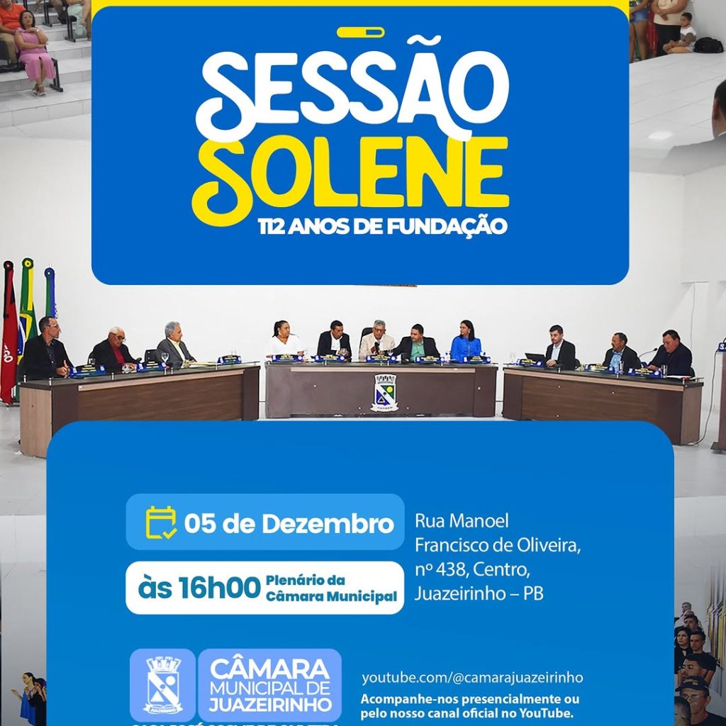A Câmara Municipal de Juazeirinho realizará, no dia 05 de dezembro, às 16h, uma Sessão Solene dedicada à concessão de Títulos de Cidadania Juazeirinhense, Moções de Aplausos e outras honrarias. O evento, que ocorrerá no Plenário da Casa Legislativa, visa a reconhecer e celebrar personalidades que se destacam por sua relevante contribuição ao desenvolvimento social, […]